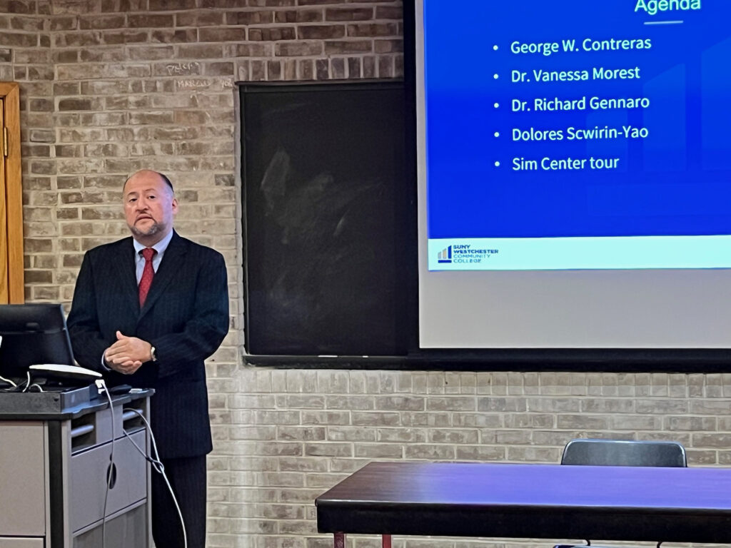 We celebrated the opening of the new Health Sciences Simulation Center for Interprofessional Education, the “Sim Lab” for short, which was largely funded by contributions from generous donors to the WCC Foundation. The Sim Lab will allow students in a range of healthcare professions including nursing and paramedic studies to practice clinical skills on specially programmed, lifelike mannikins, making it possible for SUNY WCC to train more students for these high-demand fields. Participants in the ribbon-cutting included County Executive Ken Jenkins, SUNY WCC Board of Trustees Chair Dr. LeRoy Mitchell, SUNY WCC President Dr. Belinda Miles, WCC Foundation President Susan Elion Wollin, Dean of the School of Health Sciences and Wellness Dr. George Contreras, Health, Human Performance and Physical Education Department Chair Dr. Richard Gennaro, and nursing student speaker Marie-Anne Odink. (This event is just before I run out for the plane. Carrie, Chrissy or Ilene will send you pictures)