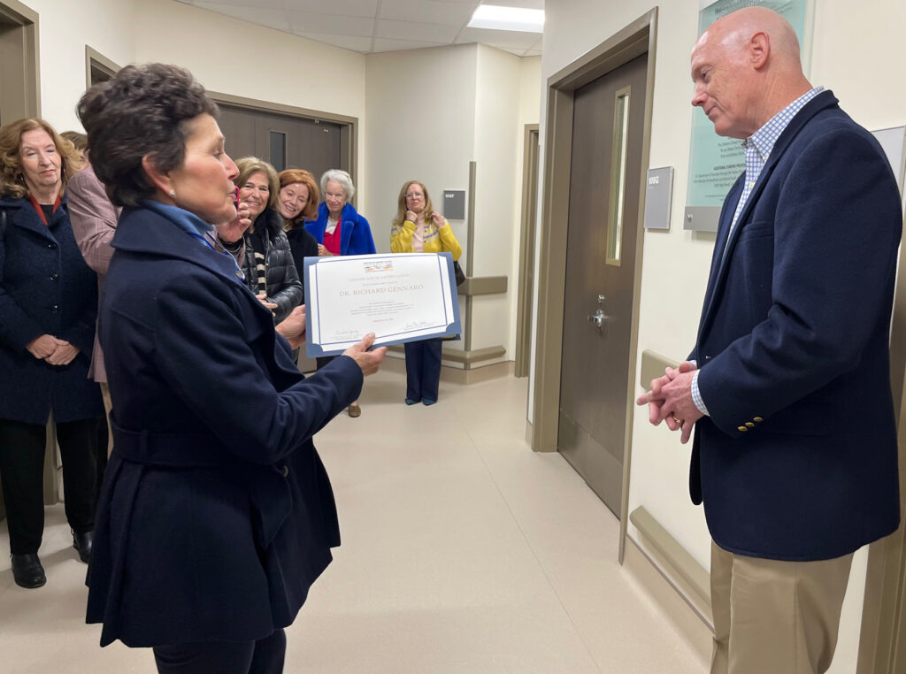 Board President Susan Wollin presented a certificate of appreciation to Professor Richard Gennaro, who had led the effort to build the Center, which was made possible by generous supporters of the WCC Foundation.