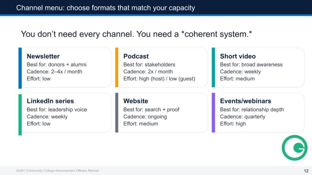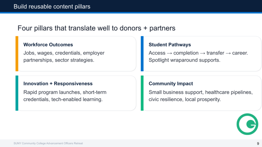 It is a small conference—about 50 people—which gives us a chance to get to know each other, including at an evening reception sponsored by Plan A Advisors. We had a chance to participate in roundtable discussions, and took part in a lively Q and A session with our peers. We heard presentations from our sponsors Kindsight, Blackbaud, Good Rebellion, Dupli, FundMiner and GiveCampus. Our vendor-sponsors have remarked that it is helpful for them to learn about our challenges so that they can help to meet the needs of their community college clients.