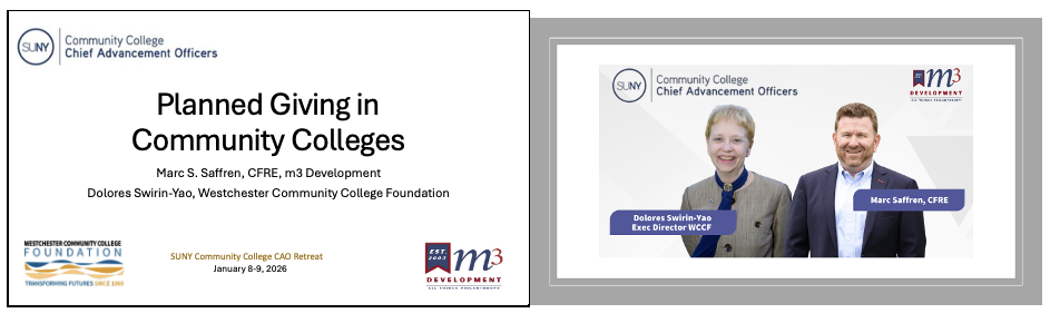 My longtime colleague, Marc Saffren of m3 Development, co-presented with me on strategies for encouraging alumni, board members and other friends to include their community colleges in their estate plans.